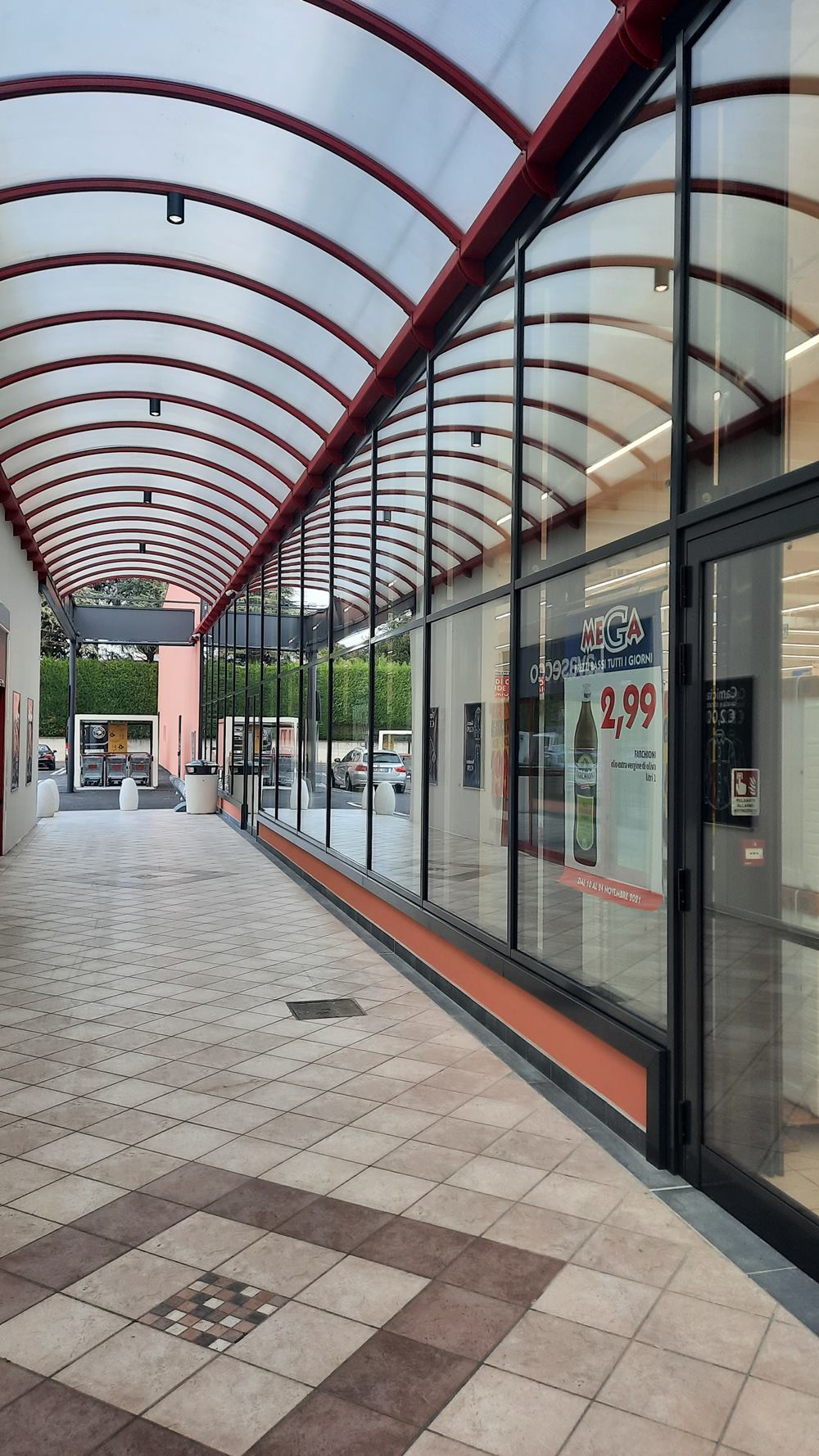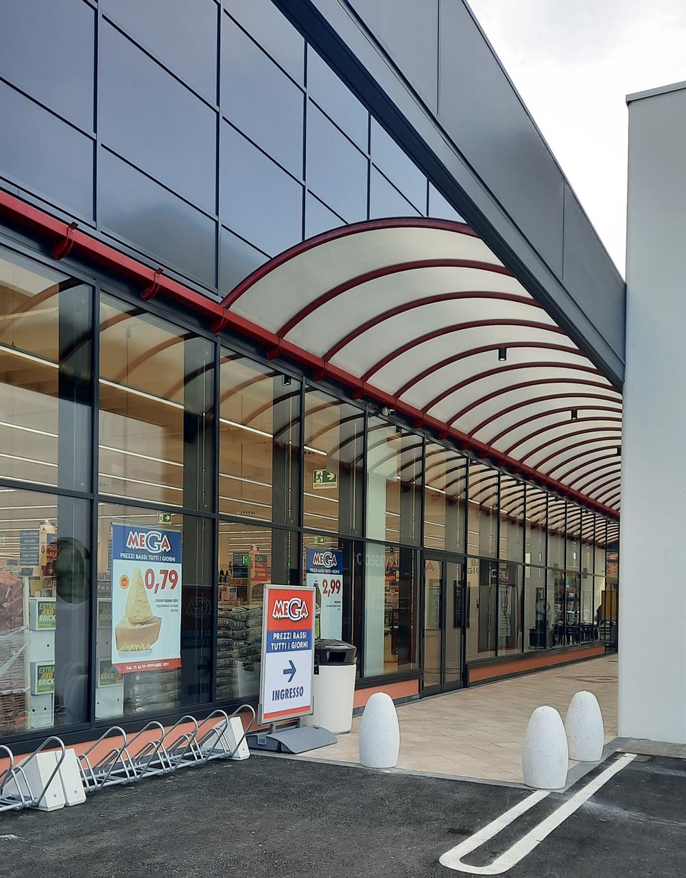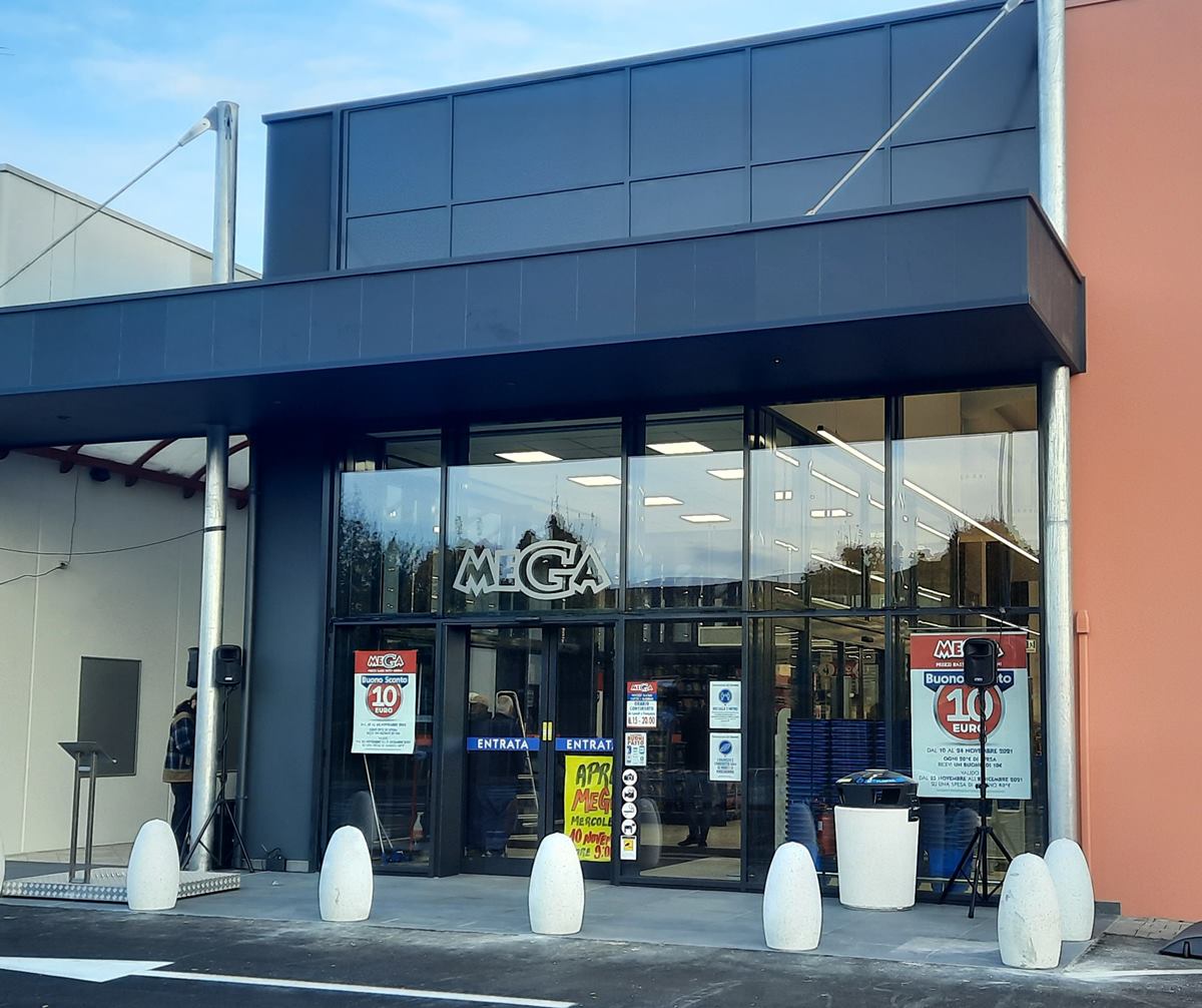 Riqualificazione punto vendita Mega: realizzazione di carpenterie metalliche e tamponamenti in alluminio e vetro.
