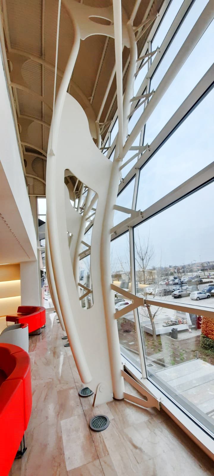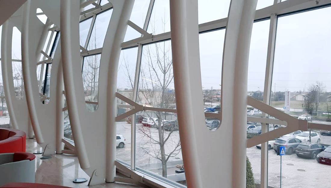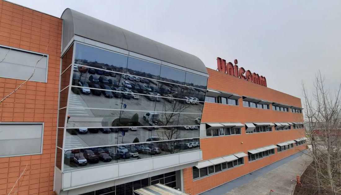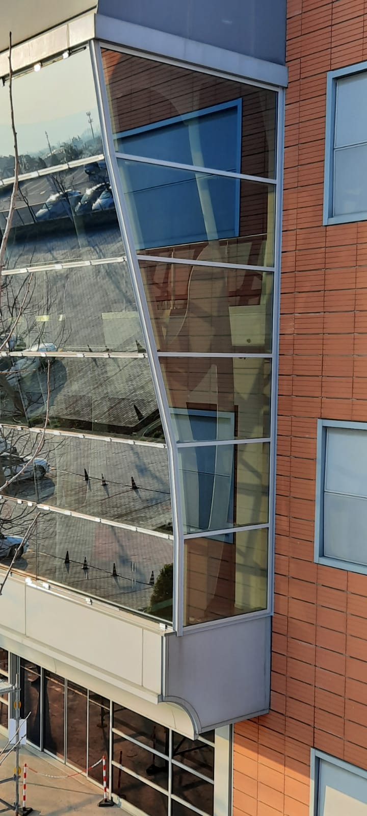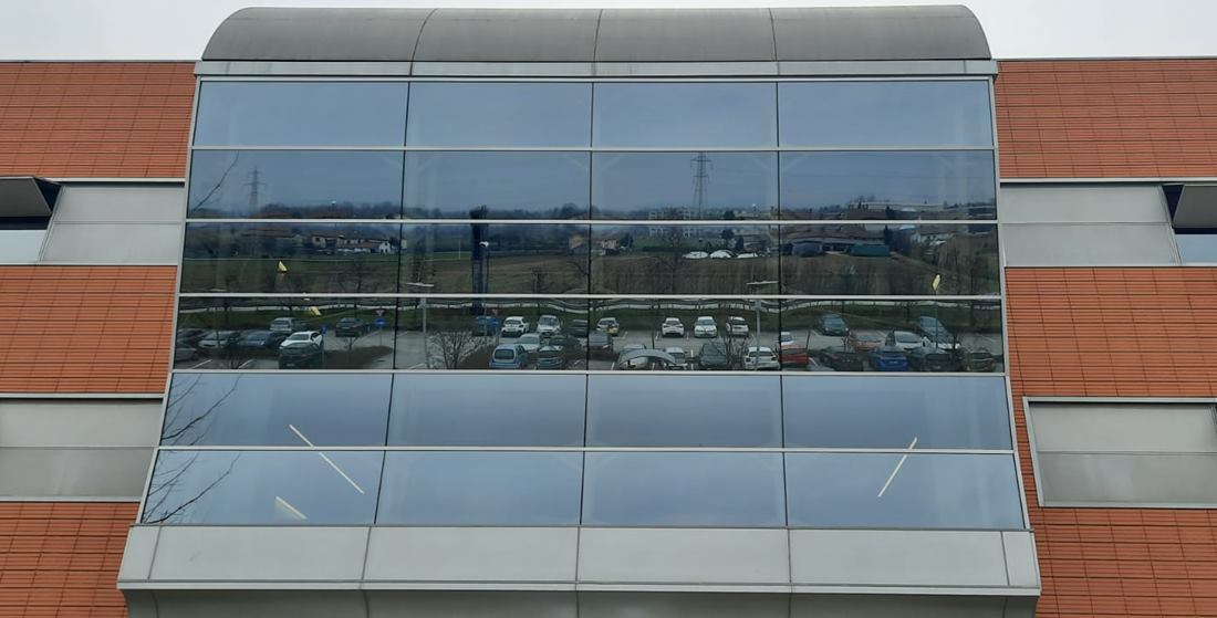 Manutenzione straordinaria della facciata di ingresso con totale sostituzione della superficie vetrata al fine di implementare le caratteristiche prestazionali, ermetiche e acustiche.